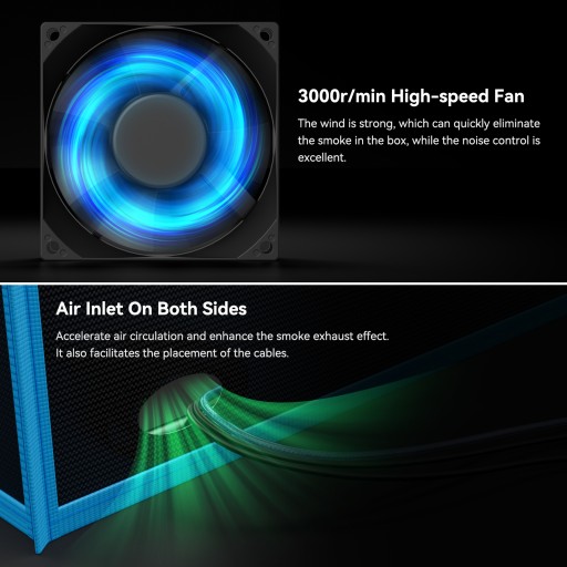 4. Silny wentylator ssący: Skrzynia jest wyposażona w szybki wentylator 3000 obr./min i średnicy 80 mm, który może wytworzyć silne ssanie, biorąc pod uwagę zarówno efekt dymu, jak i kontrolę hałasu. Może szybko usunąć dym ze skrzynki w zamknięta skrzynka oddymiająca.