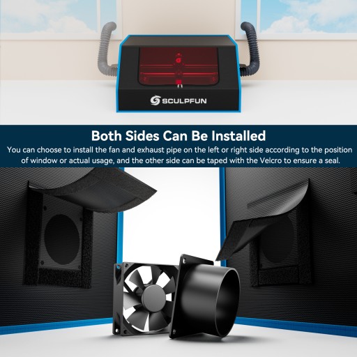 1. Wygodna konstrukcja: Skrzynka oddymiająca jest wyposażona w dodatkowe otwory kablowe po lewej i prawej stronie, dzięki czemu łatwiej jest przeprowadzić kable grawerowane laserowo lub przewody pomocnicze powietrza. Po lewej i prawej stronie znajdują się również otwory wentylacyjne. Wentylator i rurę wydechową można zamontować po lewej lub prawej stronie, w zależności od położenia okna lub faktycznego użytkowania. Druga strona jest podklejona rzepem, aby zapewnić szczelność.