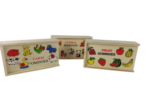 Domino wykonane z drewna z różnymi motywami zwierzęcymi oraz owocowymi