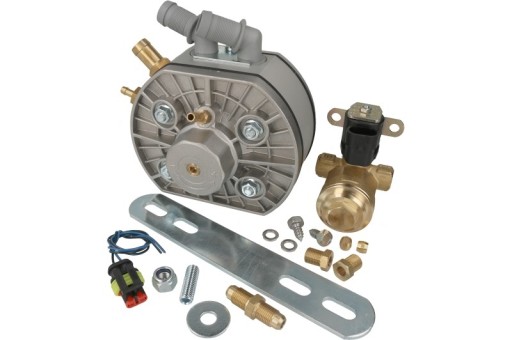 Reduktor z elektrozaworem i wszystkimi niezbędnymi do zamontowania i połączenia elementami. Wejście gazu do elektrozaworu na przewód miedziany 6 milimetrów, wyjście gazu z reduktora o średnicy 11 milimetrów.