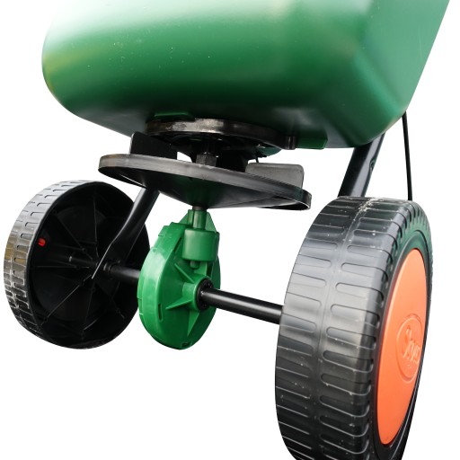 Siewnik na kółkach umożliwia precyzyjne dozowanie nawozu biorąc pod uwagę wielkość granulatu i dawkę nawozu na 1m3 . Posiada mechanizm 'stop', ma też regulację ustawienia - szerokość rozsiewu do 300cm.