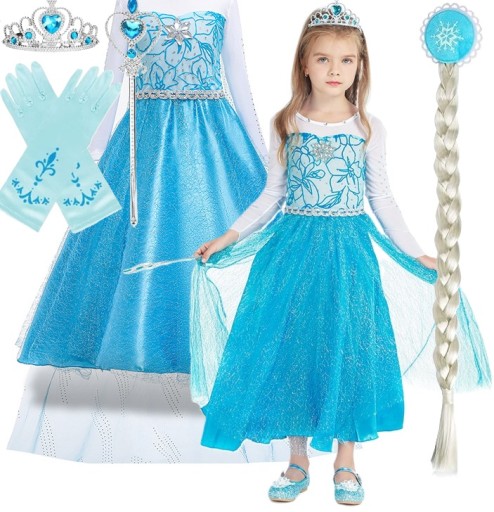 ⭐️ Przepiękny kostium ELSY na bal karnawałowy. Sukienka z akcesoriami prosto z kinowego hitu Śnieżna Kraina - ELZA. Strój świetnie odwzorowuje podobieństwo sukni Elsy. Kostium został starannie uszyty z połyskujących i błyszczących materiałów. Na gorsecie zostały przyszyte błyszczące brylanciki w kształcie płatka śniegu, a rękawy uszyte z delikatnej białej mgiełki. Dół sukni uszyty został z 2 warstw: pierwsza to połyskujący materiał, a druga prześwitująca srebrzysta tkanina. Dodatkowo do zestawu został dołączony tren, który mieni się pięknymi cekinami.