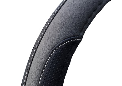 Pokrowiec na kierownicę wykonany z wysokiej jakości ekoskóry perforowanej połączonej z ekoskórą gładką.