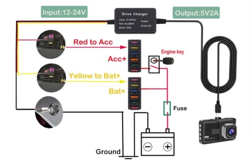 - Przewód czerwony: + 12V po włączeniu stacyjki
