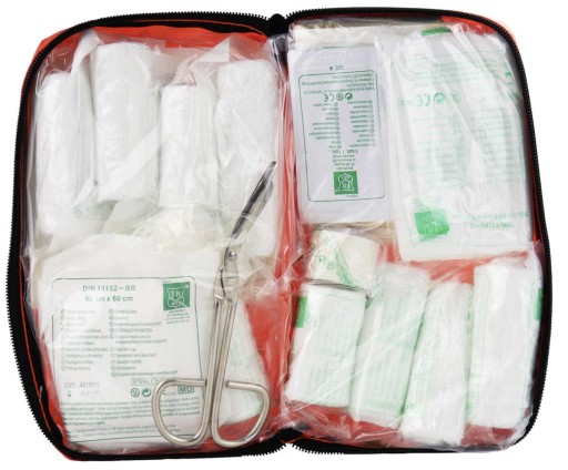 Apteczka pierwszej pomocy DIN zawiera opakowanie z tkaniny w wodoodpornej. Dzięki temu można skorzystać z apteczki turystycznej w dowolnym miejscu w różnych warunkach. Zawiera najpotrzebniejsze środki opatrunkowe, niezbędne w podróży.