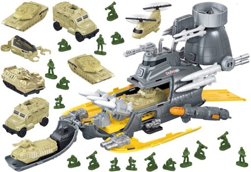 Realistyczny wojskowy zestaw militarny z pewnością spodoba się każdemu dziecku i zapewni wiele godzin niezapomnianej zabawy. Dużo elementów ułatwia zabawę oraz pozwala na toczenie wielkich pojedynków. Łódź podwodna kontener posiada zamykane schowki na pojazdy, żołnierzy lub broń!