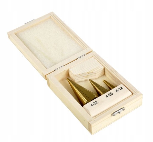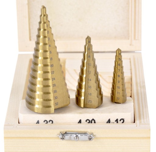 Komplet wierteł stopniowych ze stali HSS powlekanej warstwą tytanu. Zestaw pozwala na wiercenie idealnie okrągłych otworów w stali, mosiądzu, miedzi, aluminium, drewnie i tworzywie sztucznym.