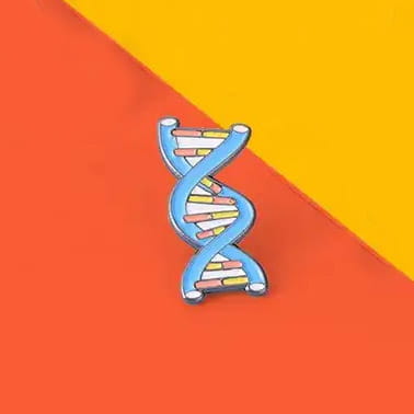 Kolorowa, metalowa przypinka przedstawiająca kolorowy znak symbolizujący DNA.
