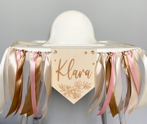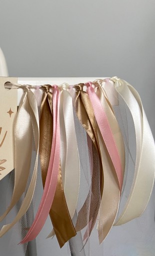 Proporczyk na krzesełko z imieniem i różowymi wstążkami doda uroku i charakteru każdej uroczystości.