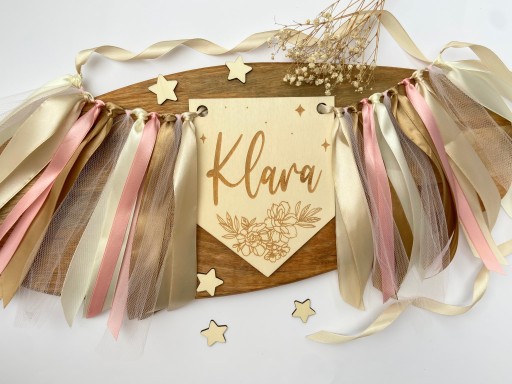 ✴️ Proporczyk na krzesełko ze sklejki drewnianej, z dowolnym imieniem, satynowymi wstążkami i tiulem.