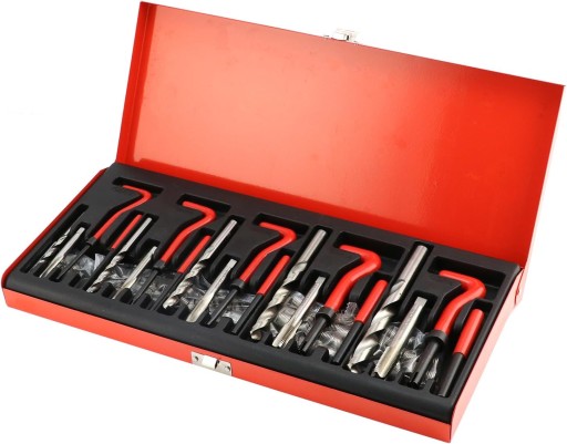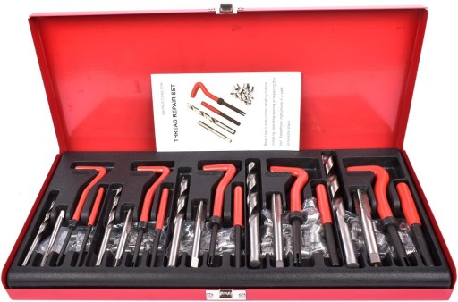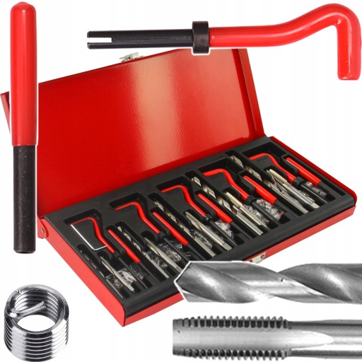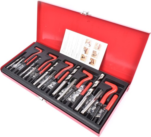 Opis produktu: Zestaw do naprawy, regeneracji najbardziej popularnych gwintów. Wszystkie wiertła i gwintowniki wykonano z najlepszej jakości materiałów. Gwintowniki jednostopniowe idealnie nacinają gwint, w który wprowadza się wkładkę spiralną z twardej stali nierdzewnej. Całość w praktycznej walizce.