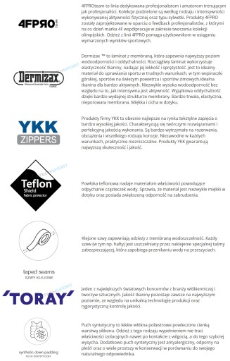 Wysoce zaawansowana technicznie zimowa kurtka firmy 4F z nowej kolekcji wykonana w technologii 4FShell. Charakteryzuje się najwyższą jakością wykonania oraz nowoczesnym atrakcyjnym designem zgodnym z najnowszymi trendami. Wykonana z technicznego materiału o wysokim współczynniku sprężystości 4FShell z membraną Toray Dermizax, który zapewnia najwyższą ochronę podczas zimowych aktywności. Klejone szwy i hydrofobowa impregnacja teflonem ograniczają absorbcję wody z zewnątrz. Wewnętrzna poliestrowa ocieplina zatrzymuje ciepło wewnątrz, a specjalistyczna podszewka black-silver gwarantuje dodatkową izolację przed niesprzyjającymi warunkami w okresie zimowym. Doskonała do codziennego użytku oraz intensywnego aktywnego wypoczynku jako kurtka narciarska. Dzięki nowatorskiej technologii kurtka jest wygodna, sama dopasowując się do użytkownika, nie krępuje żadnych ruchów. Kurtka posiada różnego rodzaju kieszonki, m.in. na gogle, komórkę czy karnet, pas śnieżny oraz wiele innych innowacyjnych rozwiązań. W kurtce zastosowano membranę Toray Dermizax 20.000, jest to wysokiej jakości membrana PU, która zabezpiecza użytkownika przed wilgocią pochodzącą z otoczenia. Dzięki milionom mikrootworów znajdujących się w materiale, Dermizax ma potrójne właściwości: blokuje wiatr i wodę pochodzącą z otoczenia oraz wydala na zewnątrz pot i wilgoć powstającą w wyniku zwiększonego wysiłku fizycznego. Kurtka posiada dodatkowo wysoką stójkę, ochraniacz brody przed zapiętym zamkiem, wodoodporne zamki YKK (laminowane i wiatroszczelne), rzep w mankietach z dodatkowymi mankietami z wycięciem na kciuk oraz regulację dołu kurtki za pomocą ściągacza i stoperów. Dzięki swojej elastyczności doskonale dopasowuje się do sylwetki. Niska waga dodatkowych warstw oraz efektywny system wentylacji gwarantuje komfort termiczny. Idealna do wszystkich rodzajów sportów outdoorowych jak i codziennego użytku.