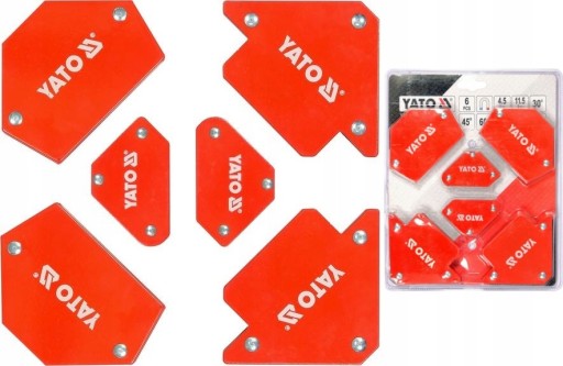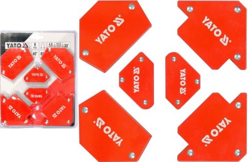 Zestaw 6 kątowników spawalniczych magnetycznych YT-08679 wykonanych z blachy stalowej oraz silnych magnesów ferrytowych. Powierzchnia lakierowana proszkowo. Przeznaczone do czasowego łączenia metalowych elementów podczas spawania, nawiercania, lakierowania.