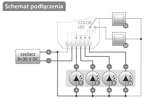 COLOR LED (RGBW) - to sterownik kolorowego oświetlenia LED z dodatkowym kanałem dla światła białego. Umożliwia precyzyjne nastawy kolorów lub regulację temperatury barwowej światła białego. Zapewnia płynne przejście pomiędzy kolorami. Czasy przejścia pomiędzy kolorami oraz ściemniania są konfigurowalne.