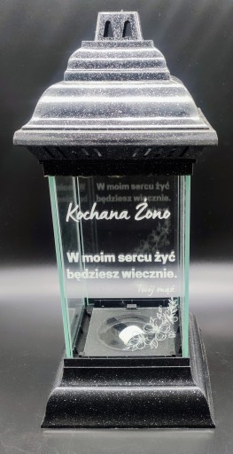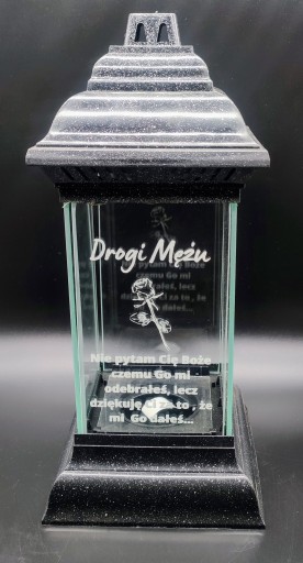 Piękny znicz całoroczny w kształcie wieży , kolumny / ZNICZ PERSONALIZOWANY TRWAŁĄ METODĄ GRAWEROWANIA SZKŁA / sz