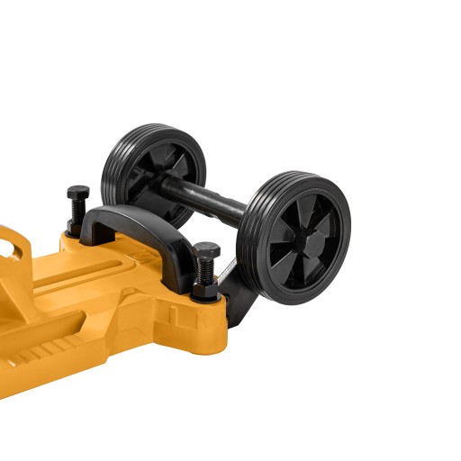Podstawa statywu wyposażona jest w cztery śruby stabilizujące, pozwalające na montaż maszyny na nierównej płaszczyźnie, oraz kółka jezdne, zapewniające łatwy transport. Dźwignia posuwowa może być montowana zarówno z prawej, jak i z lewej strony statywu, w zależności od możliwości i preferencji osoby obsługującej wiertnicę. Dla jeszcze większego komfortu.