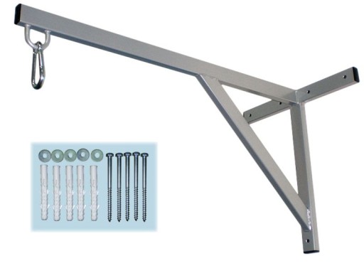 Doskonały uchwyt do zawieszenia worka bokserskiego. Mocowany do ściany za pomocą pięciu kołków rozporowych. Wykonany z profilu stalowego o przekroju 40x20 mm. Ucho wykonane z pręta stalowego o średnicy 10 mm. W komplecie karabińczyk φ10x100. Całość pomalowana lakierem proszkowym na kolor srebrny.