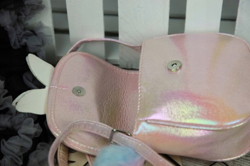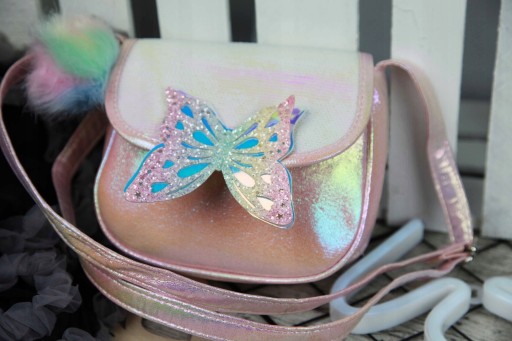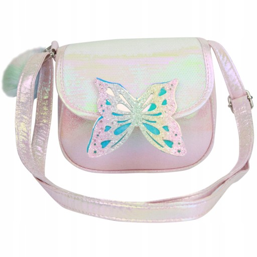 Klapa torebki wyszyta pięknie mieniącymi cekinami. Dodatkowo uroku dodaje niesamowity motyl, którego skrzydełka pokryte są błyszczącymi drobinkami. Ponadto do torby dołączony jest brelok puszek w pastelowych kolorach.