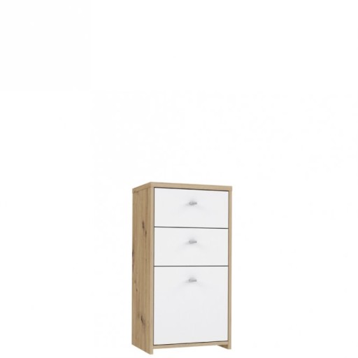 Komoda ma nowoczesny i uniwersalny wygląd, który pasuje do różnych stylów aranżacyjnych. Komoda ma dekor Dąb Artisan z Białymi frontami, który tworzy ciepły i przytulny klimat. Komoda ma również metalowe uchwyty i nóżki, które dodają jej lekkości i elegancji.