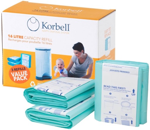 Ekologiczny wymienny wkład do kosza na pieluszki Korbell. Worki na zużyte pieluchy KORBELL są elastyczne i mocne. Ulegają w 100% biodegradacji i w 20% są wykonane są z materiałów pochodzących z recyklingu.
