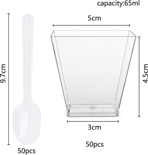 - Elegancki Design Kubków: Kubki wykonane są z przejrzystego plastiku, co dodaje im elegancji i pozwala podziwiać zawartość. Ich minimalizm i stylowy wygląd sprawiają, że doskonale nadają się do podawania różnych deserów.