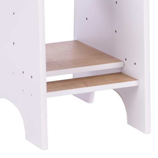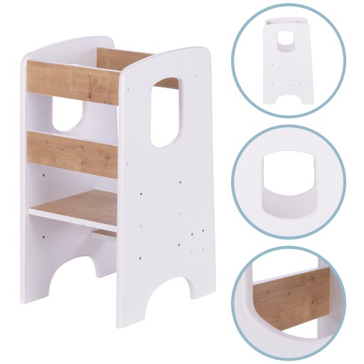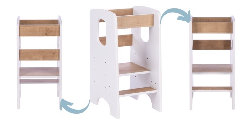 Dzięki zastosowanemu systemowi regulacji podest można dostosować do wzrostu dziecka tak, aby komfortowo mogło wraz z rodzicem korzystać z blatu kuchennego.