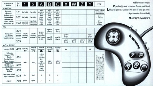 Joypad "BOOMERANG" B102 na stykach gumowych (z gumy przewodzącej prąd - jak w kalkulatorach) z autofire. Jest to joypad z funkcjami jak joystick MATT-AFF. czyli rozbudowany o auto-fire joypad B101. Joypad "BOOMERANG" B102 przeznaczony do komputerów domowych typu Amiga (np. 500, 600, 1200), Atari (np. 65XE, 130XE, 130ST), Commodore (np. C64) oraz niektórych konsoli - np.typu Atari 2600.