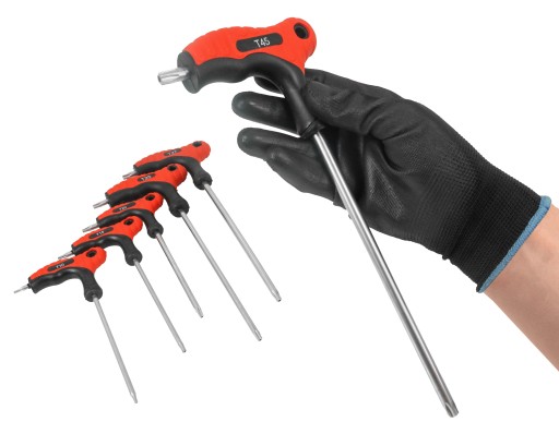 Zestaw wkrętaków typu torx został wykonany z wysokiej jakości materiałów. Rączka została wykonana z tworzywa sztucznego pokrytego gumową powłoką, co zapewnia pewny chwyt w dłoni.