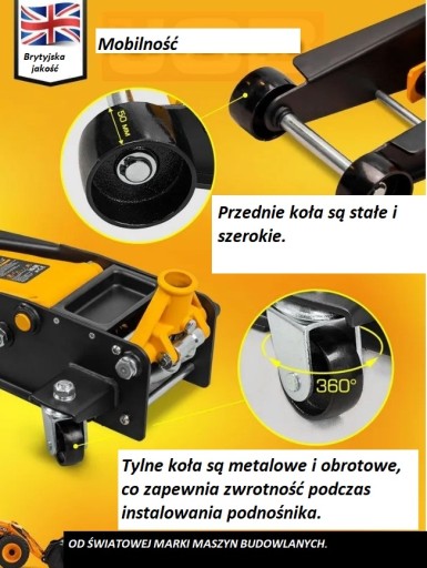 Kółka : dzięki nim ustawisz podnośnik w dowolnym punkcie pod samochodem. Możesz nim łatwo manewrować nawet na chropowatych powierzchniach.