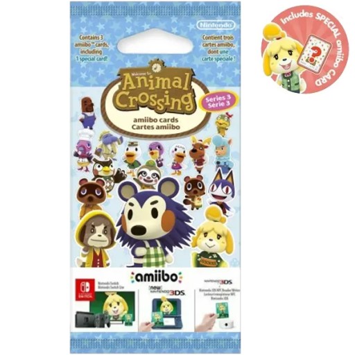 Każdy pakiet kart amiibo Animal Crossing zawiera trzy karty amiibo Animal Crossing, z tego jedna z tych trzech zawsze będzie specjalną kartą amiibo. Możesz używać tych kart w różnych grach i otrzymać kogoś wyjątkowego, lub odwiedzą Cię zwierzęcy przyjaciele. Każda karta może być wykorzystana w wielu kopiach gry, więc idealnie nadają się do kolekcjonowania oraz wymiany ze znajomymi.