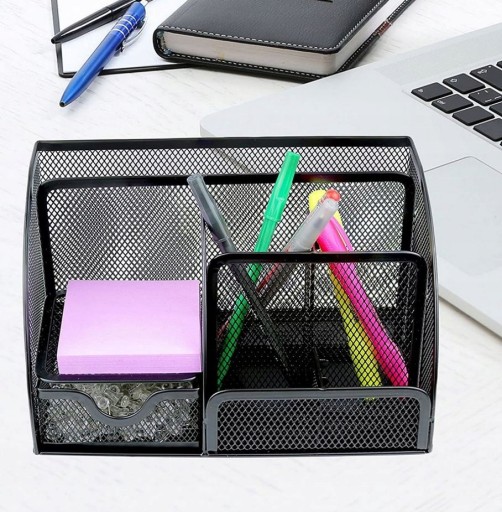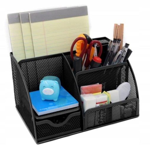 Porządek w miejscu pracy jest niezwykle ważny, ponieważ daje możliwość skupienia się na wykonywanej pracy. Prezentowany przybornik na biurko to bardzo praktyczne akcesorium, które przyda się zarówno w domu, jak w pracy i wielu innych miejscach. Bez problemu zmieszczą się w nim wszystkie niezbędne przybory biurowe, do których należą długopisy, kredki, pisaki, gumki, spinacze, kleje, czy też nożyczki, a także artykuły piśmienne.
