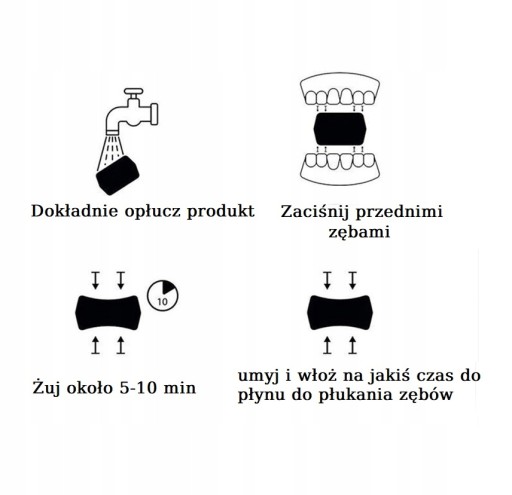 1. Przed użyciem w celu dezynfekcji i przygotowania produktu wrzuć przyrząd do ćwiczenia żuchwy do gotującej się wody. Odczekaj chwilę i wyjmij go.