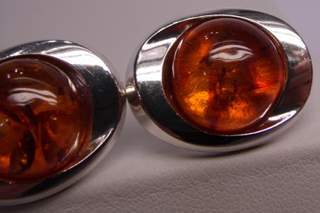 Srebrne spinki z bursztynami - półkule. Spinki wykonane ze srebra próby 0,835, masa 14,880 g. Imiennik RJ. Wymiary ozdoby 1,7 x 2,2 centymetra. W spinkach oprawione są dwa naturalne bursztyny o średnicy 1,3 centymetra. Stan idealny – jak nowe (z metką, zapakowane w pudełko)