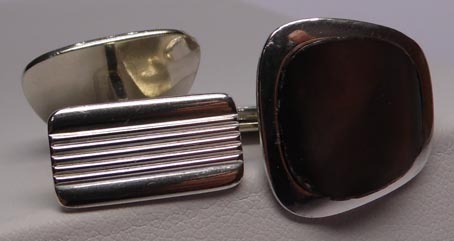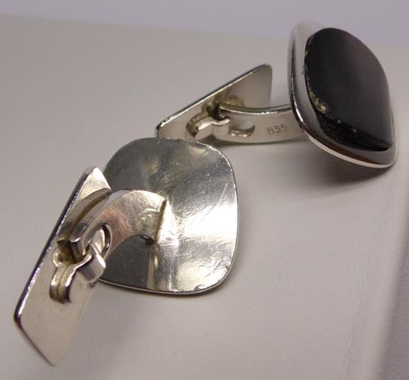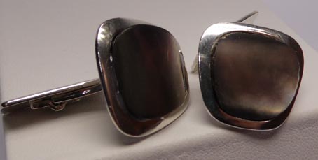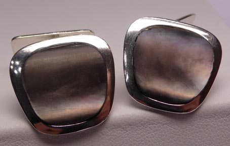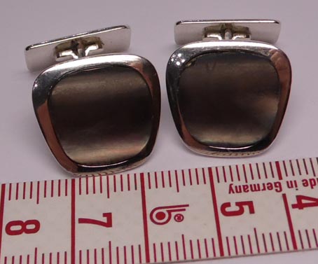 Srebrne spinki z masą perłową. Spinki wykonane ze srebra próby 0,835, masa 11,970 g. Wymiary ozdoby 1,7 x 1,9 centymetra. W spinkach oprawione są płytki wykonane z masy perłowej (odcień szary). Spinki profesjonalnie odnowione, z metką, zapakowane w pudełko.