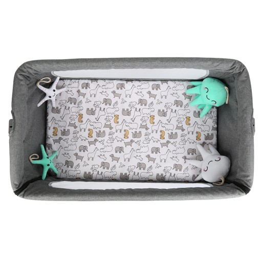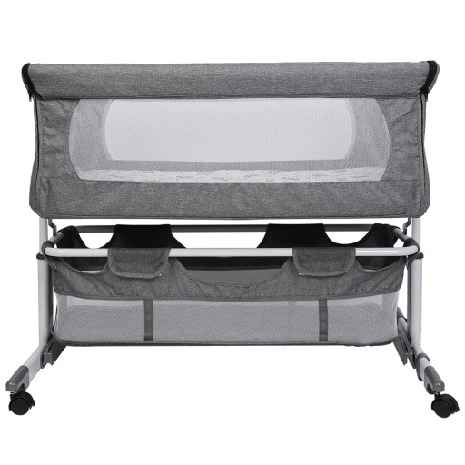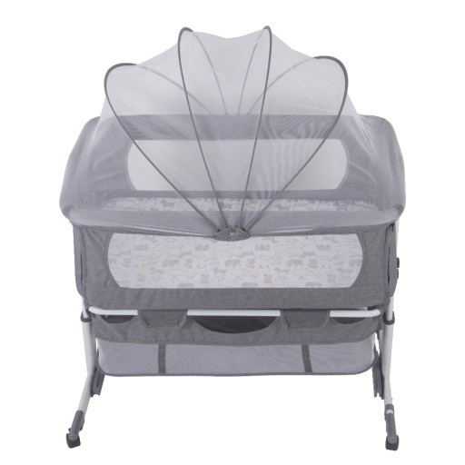 Odpowiedni wiek: 0-36 miesięcy, łóżeczko z funkcją podnoszenia na wysokość, pod spodem znajduje się również torba na rzeczy dziecka.