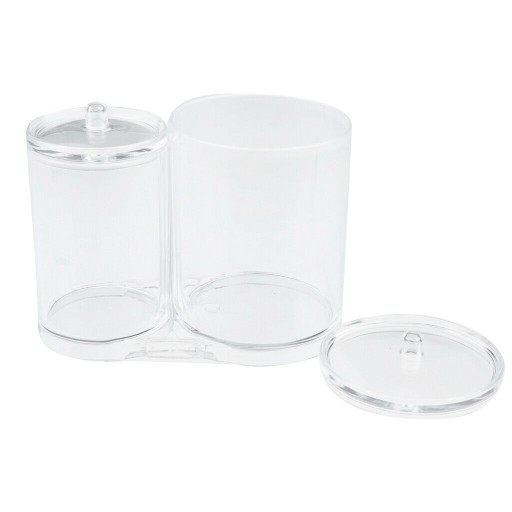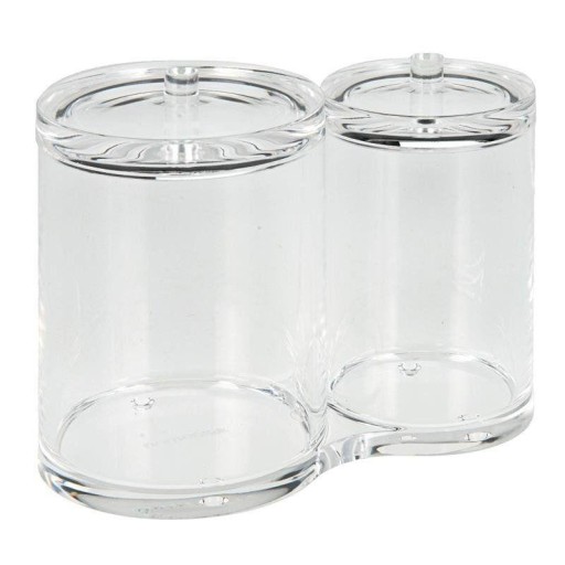 Praktyczny, wykonany z grubszego, elegancko połyskującego akrylu organizer na różnej wielkości kosmetyki, akcesoria i pędzle do makijażu lub płatki, patyczki i waciki. Pozwala w sposób łatwy i praktyczny uporządkować swoją toaletkę. Łącznie ma 2 komory, które posiadają estetyczne pokrywki. Organizer jest złączony na stałe.