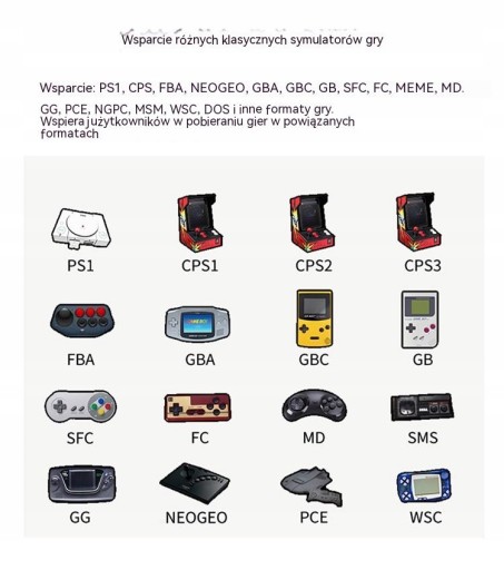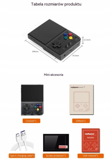 Dwie duże aktualizacje: (1) V1 lub V2 lub 2,8-calowy ekran, Miyoo Mini Plus to 3,5-calowy ekran, (2) V1 lub V2 lub 1900/2000 Mah Battey, Miyoo Mini Plus Battery to 3000 Mah.Rozmiar ekranu: 3,5-calowy ekran IPS 640x480Pamięć: 128 MBSystem operacyjny: LinuksCzujnik: silnik wibracyjnyWaga: 107gDane techniczne: 108mmX78.5mmX22.3mmProcesor: dwurdzeniowy ARM Cortex-A7 1,2 GBRozszerzenie pamięci: Karta MicroSD(TF) o pojemności 64 GB Obsługuje maksymalne rozszerzenie o 128 GBMoc: 3,7 V 3000 mAh / 5 V Interfejs ładowania Obsługuje 1A