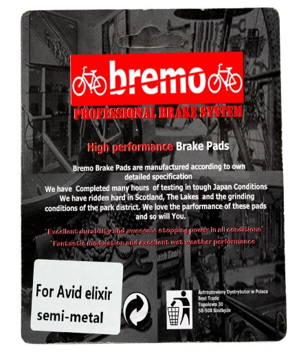 Półmetaliczne klocki BREMO to pewność najwyższej jakości. Producent japońska firm która produkuje systemy hamulcowe najwyższej klasy głównie do samochodów rajdowych, a od niedawna również rowerów. Posiadają ogromne doświadczenie w produkcji okładzin hamulcowych więc możesz być spokojny że kupujesz sprzęt najwyższej klasy.