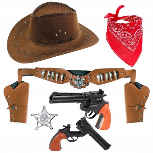 КОМПЛЕКТ КОВБОЙСКИЙ НАРЯД ДЕТСКАЯ ШЛЯПА БАНДАМА КОБУРА 2 ЗНАЧКА РЕВОЛЬВЕРЫ