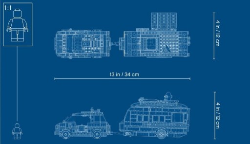 - Masz ochotę na przygodę? Przyczepa kempingowa z samochodem w stylu retro ma ok. 13 cm wysokości, 34 cm długości i 12 cm szerokości, co znaczy, że zawiera wiele fascynujących detali i jest dostatecznie duża dla poważnych poszukiwaczy wakacyjnych przygód!