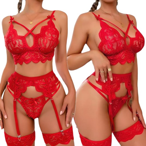 ❤️ Koronkowy biustonosz, odważnie skrojone majtki i dopasowany pas do pończoch to wszystko, czego potrzebujesz by poczuć się niesamowicie seksownie.