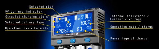 Poza szeroką kompatybilnością ładowarka charakteryzuję się także dużym i czytelnym ekranem. Podświetlenie LED ekranu ułatwia odczytywanie danych w każdych warunkach. Wyświetlacz na bieżąco pokazuje wszystkie najważniejsze informacje. Możemy odczytywać wartości ładowanych ogniw takie jak poziom naładowania, pojemność, moc ładowania oraz wiele innych danych pozwalających nam na precyzyjne kontrolowanie całego procesu.