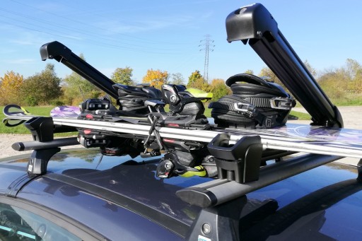 - Narty lub snowboard'y zaciskane są w bezpieczny sposób pomiędzy dwoma wysokiej jakości listwami gumowymi.