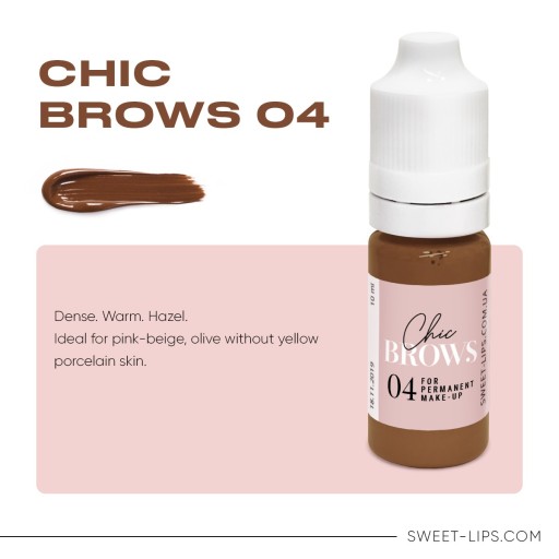 Pigment do makijażu permanentnego Chic Brows #4 to ciepły i transparentny odcień orzechowego brązu. Jest idealny dla skóry o ciepłej tonacji, złocisto-beżowej, różowo-brzoskwiniowej i ciemnobrzoskwiniowej.