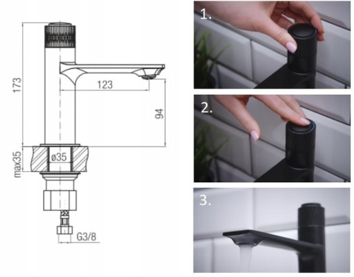 Po kliknięciu przyciskiem, uruchamiamy przepływ wody w postaci jednostajnego strumienia wody. Stopień zmieszania wody regulujemy pokrętłem, natomiast regulacja strumienia natężenia wody została zastąpiona przyciskiem Click_On – pełniącego funkcję start-stop dla przepływu wody. Dzięki temu, oszczędzamy wodę poprzez korzystanie z niej wtedy, kiedy jest nam potrzebna – wystarczy użyć przycisku Click_On.