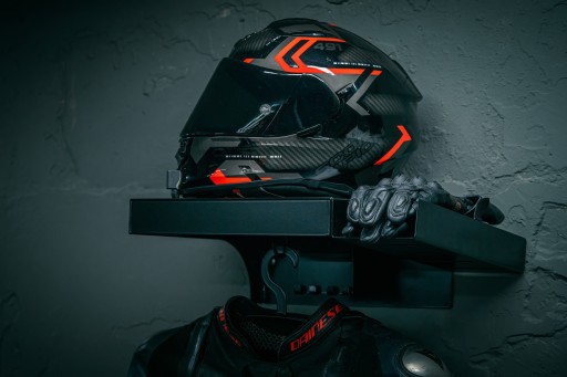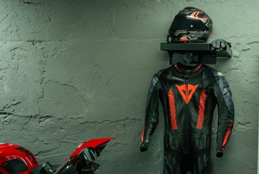 Ten wieszak ścienny jest idealnym rozwiązaniem do przechowywania kasku motocyklowego i skórzanego kombinezonu.