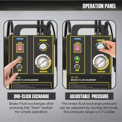 Wysoka wydajność, AST605 wymaga tylko jednej osoby do obsługi i umożliwia łatwe używanie i wymianę oleju hamulcowego. Może zmieniać cztery pompy oleju w tym samym czasie, po ustawieniu środowiska pracy cały proces wymiany jest automatyczny. Ten zestaw do odpowietrzania hamulców umożliwia wymianę płynu jednym naciśnięciem. Dokończ wymianę oleju w ciągu jednej minuty, wygodnie i szybko. Ciśnienie i częstotliwość można dowolnie regulować. Wyposażony w manometr umożliwiający obserwację wartości ciśnienia wymiany płynu.