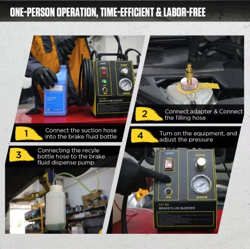 To pulsujące urządzenie do wymiany oleju hamulcowego ma zastosowanie do standardu oleju hamulcowego Dot3, Dot4, Dot5.1. Dostarczany z różnymi adapterami, AST605 jest szeroko stosowany do wymiany płynu hamulcowego w różnych modelach europejskich, amerykańskich i azjatyckich.