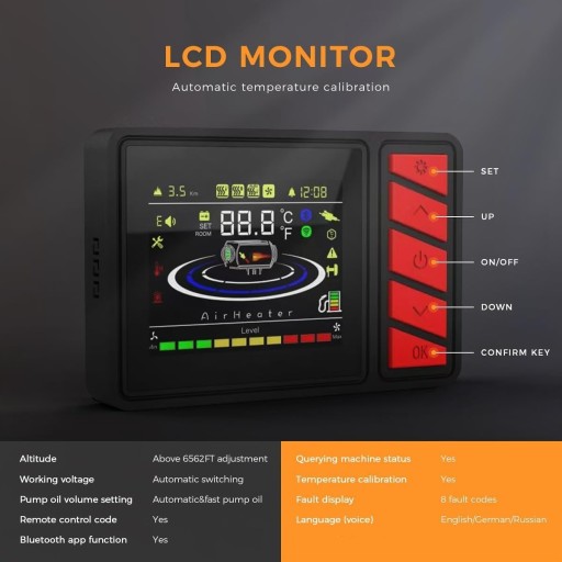 Łatwa obsługa — pilot zdalnego sterowania i monitor LCD zapewniają szybką i intuicyjną obsługę, umożliwiając wstępne nagrzewanie i zdalną regulację temperatury. Funkcja timera umożliwia ustawienie czasu rozruchu i wyłączenia, co jest przydatne w przypadku niezajętych pojazdów