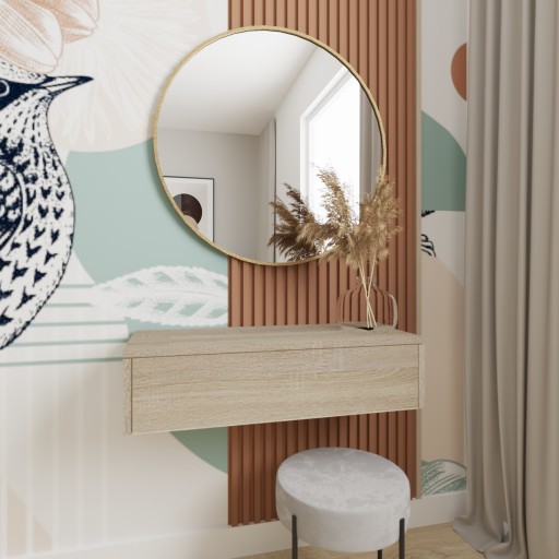 Wyjątkowa toaletka o wielu zastosowaniach zarówno może pełnić funkcję toaletki w sypialni czy też biurka. Jak również znaleźć zastosowanie w przedpokoju na podręczne rzeczy, czy po prostu element dekoracyjny Dzięki swojemu wyglądowi pasuje do klasycznego jak i nowoczesnego wnętrza. Jej wisząca forma nada lekkości w twoim wnętrzu, jak również pozwoli nam zachować czystość w trudno dostępnych miejscach do sprzątania.